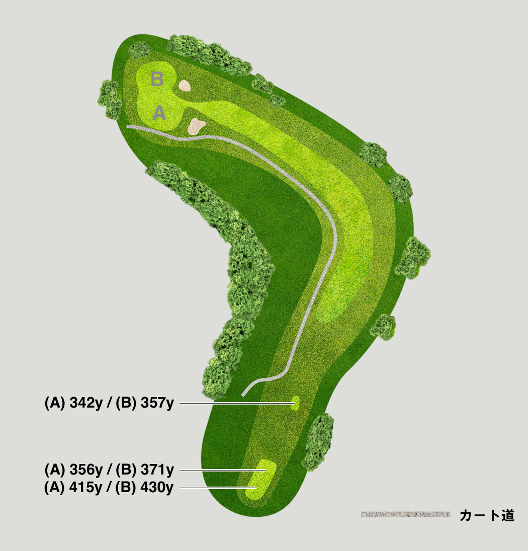 左直角に曲がるホール。杉の群越えなら残りはピッチングウェッジの距離です。