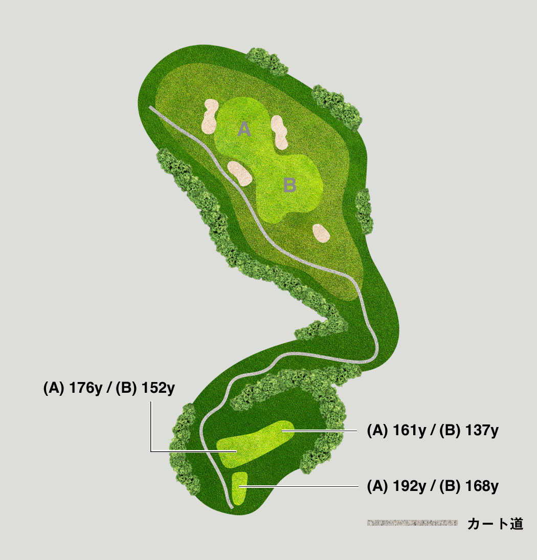難易度が最も高いショートです。風に注意し、グリーン手前狙いが安全です。