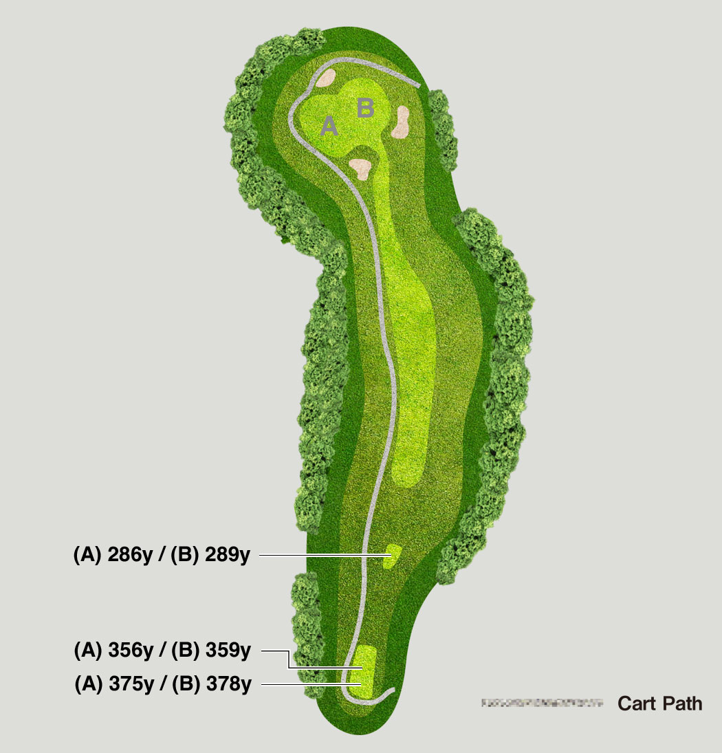 The fairway slopes left, with right OB nearby. Play straight without forcing your tee shot.