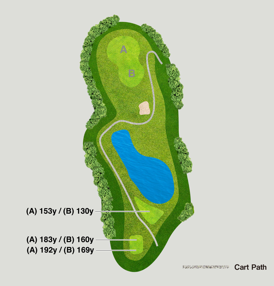 Short hole over a pond. Adjust your shot according to the green shape and watch your distance.
