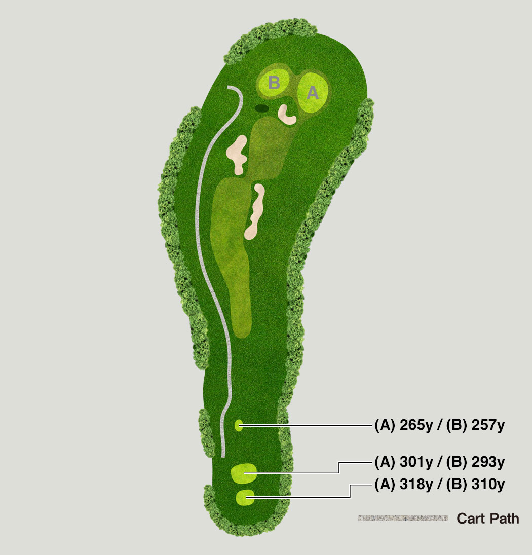 Aim your tee shot just left of the right bunker, taking care not to hit too long. The second shot calls for a confident carry to attack the green.