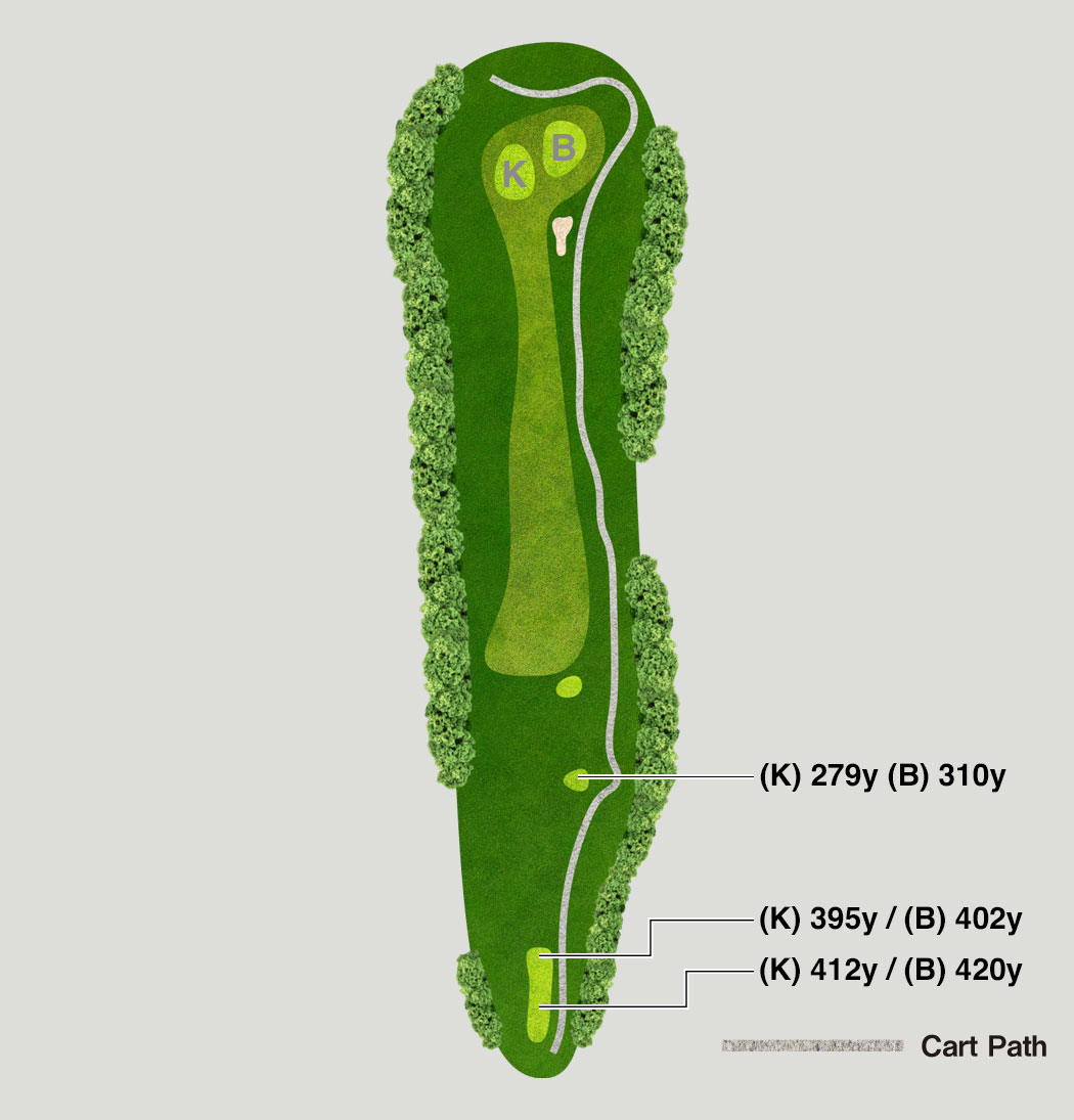 Aim for the center of the fairway, read the green’s contours, check the pin position, and proceed to your second shot.