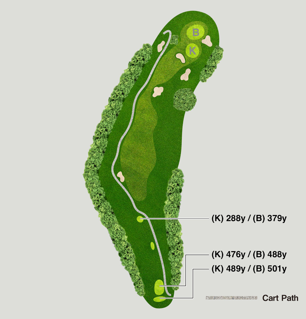 Aim for the center of the fairway and avoid the left side. Check the pin position before your third shot.