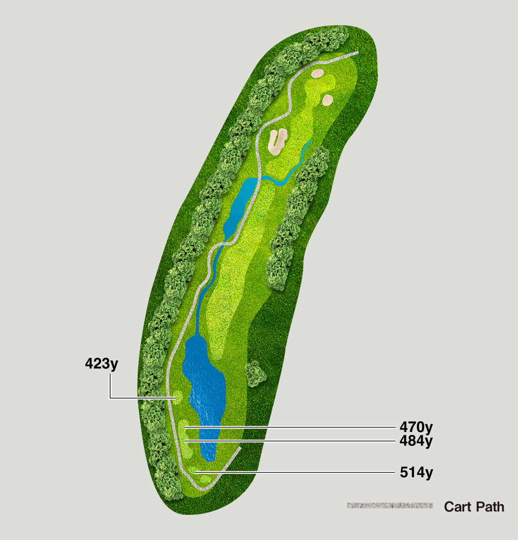 Tee shot should aim right to avoid the creek. Consider laying up on the second shot.