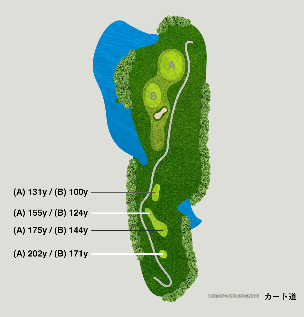 左はペナルティ、右はOBのショートホール。距離は短めですが、プレッシャーのかかる精度勝負の一打です。