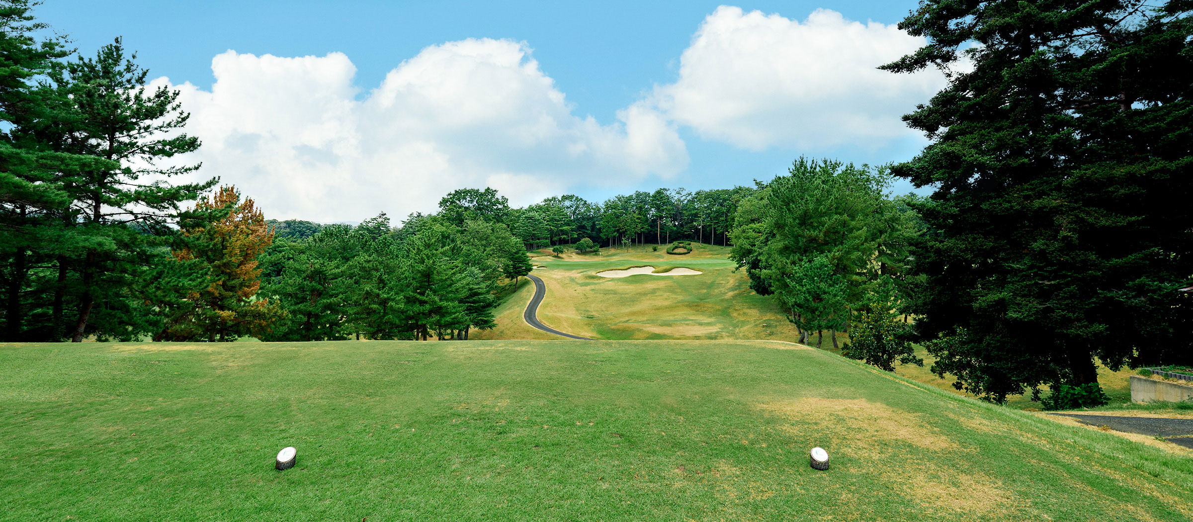 谷越えのショートホール。手前左右にバンカーがあります。クラブは大きめを選び、軽く振るのがポイントです。