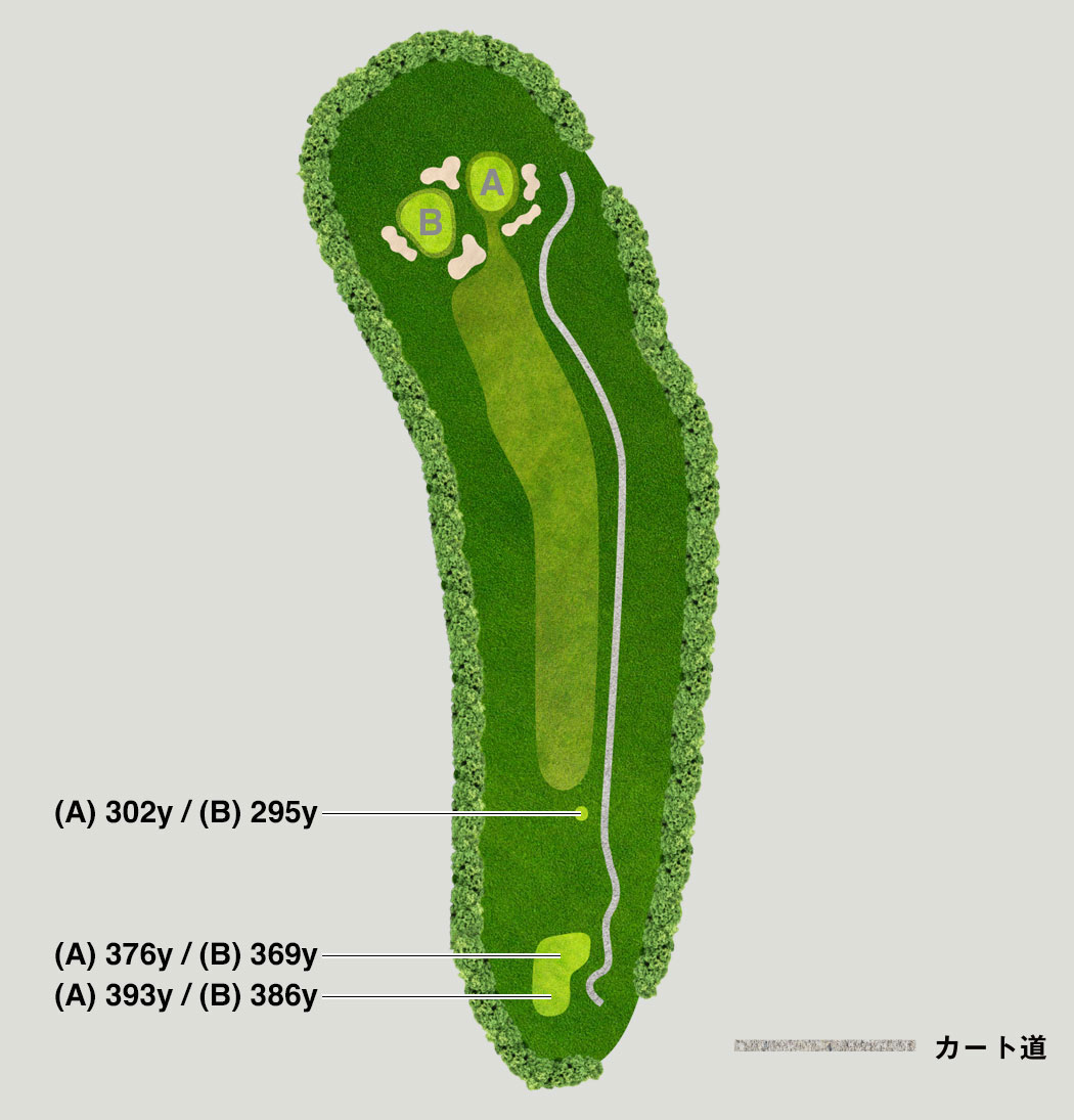 フェアウェイは広めですが距離があります。グリーンはバンカーに囲まれているため、キャリーか刻みの選択が重要です。