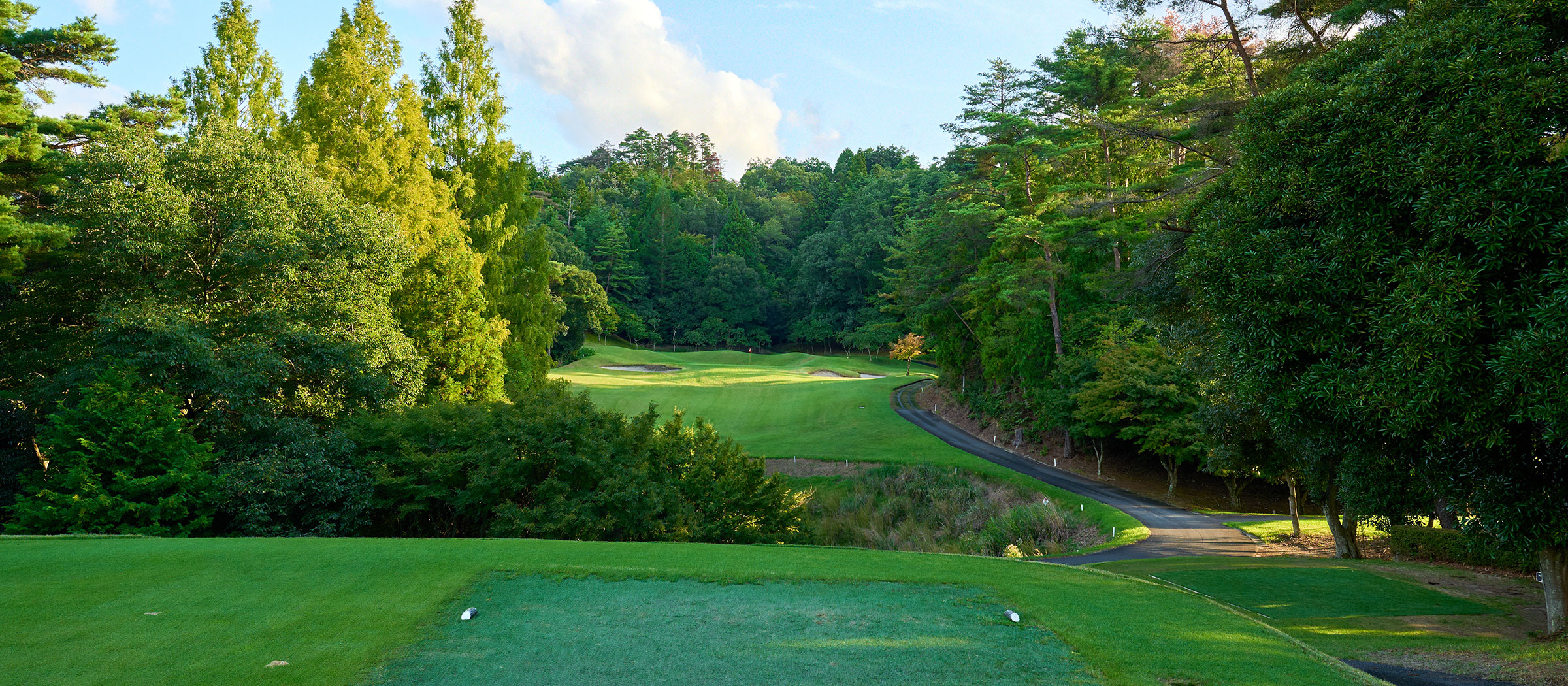 やや打ち上げのショートホール。距離を補うため大きめクラブを選び、方向性を重視して狙います。