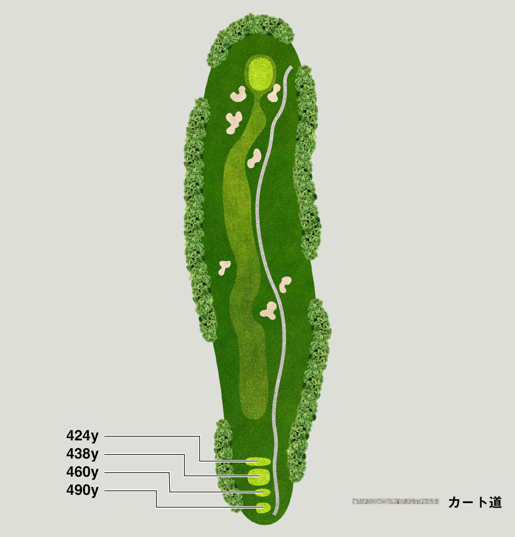 緩やかな打ち上げのロングホール。右OBに注意しフェアウェイセンター狙い、前後2段グリーン攻略が鍵です。