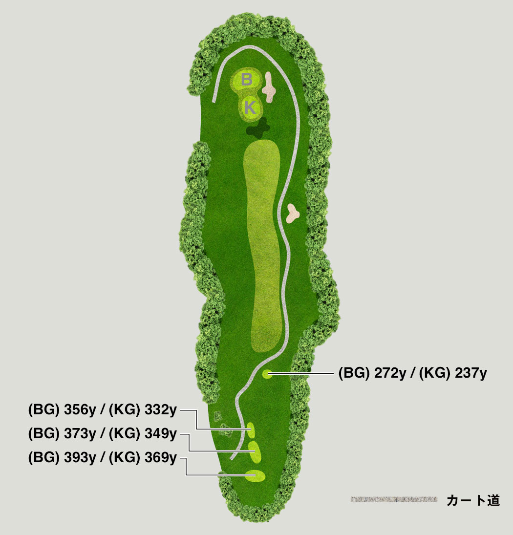 右のワンペナが浅いため、ティーショットは慎重に。グリーンは奥から速く、オーバーに注意して手前から攻めましょう。