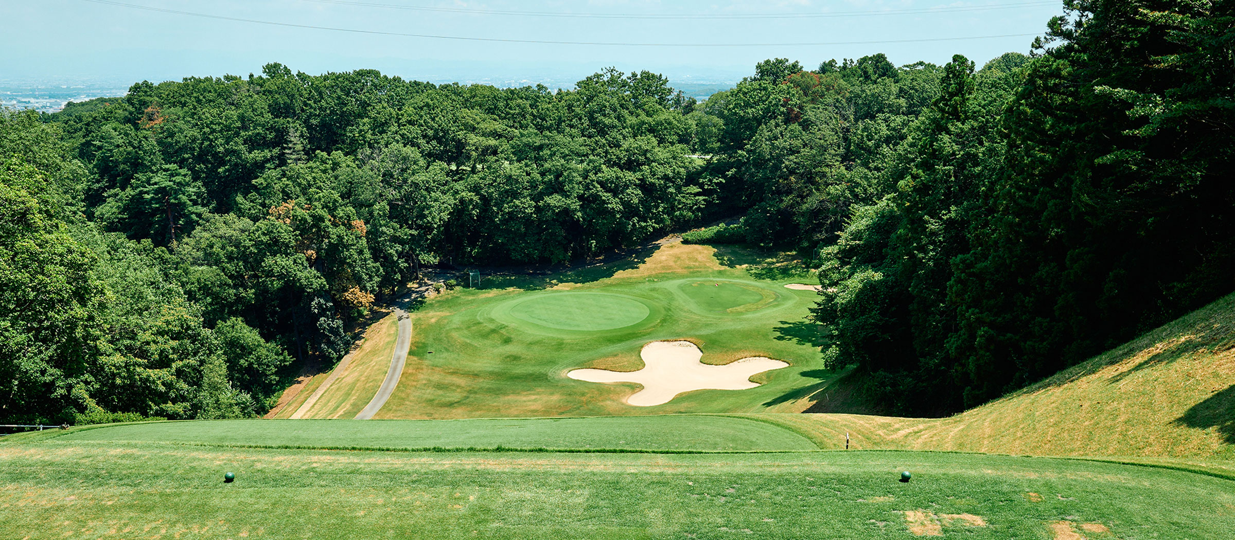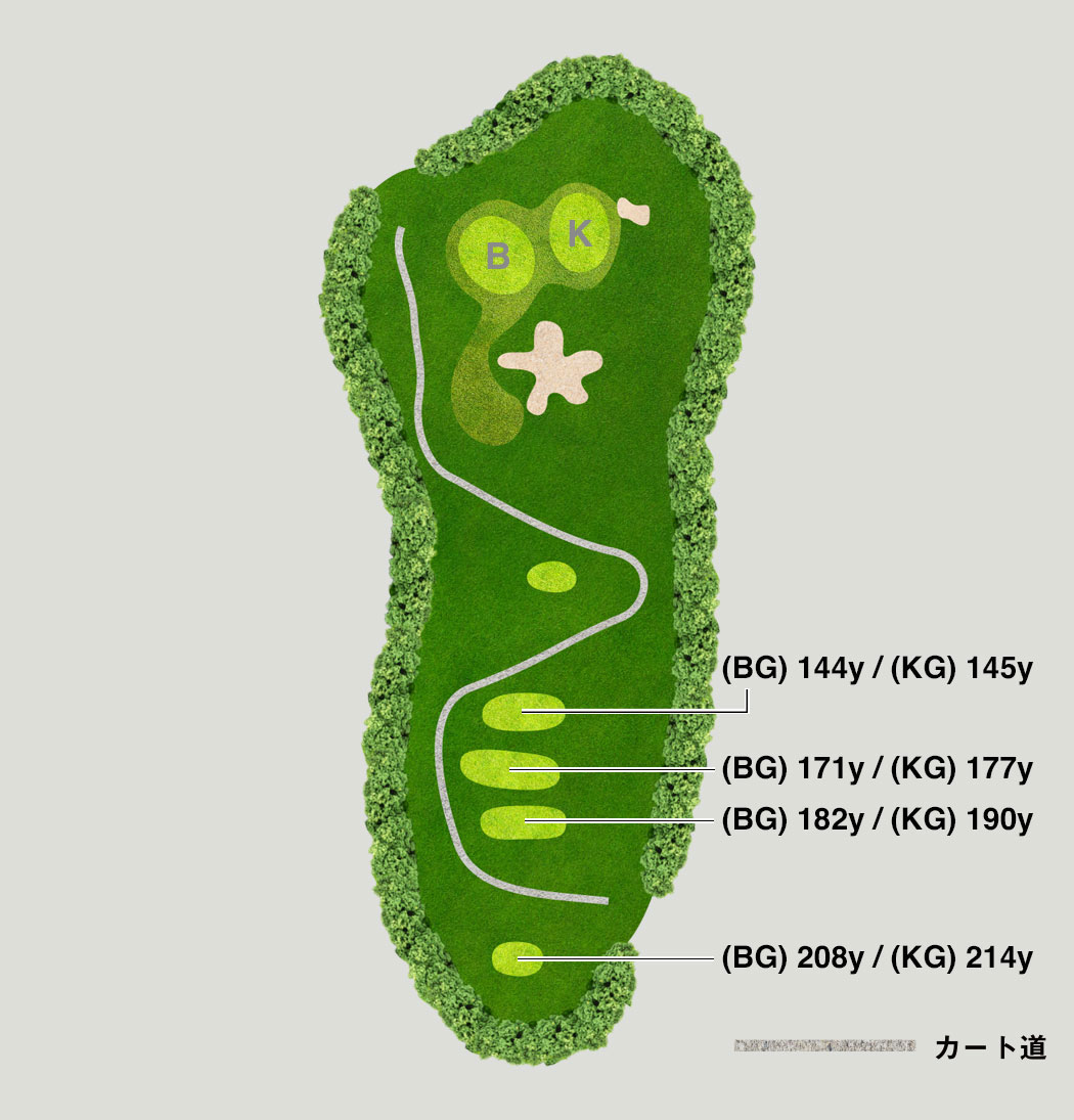 打ち下ろしの美しいホール。風の影響を受けやすく、クラブ選びと方向性に注意が必要です。