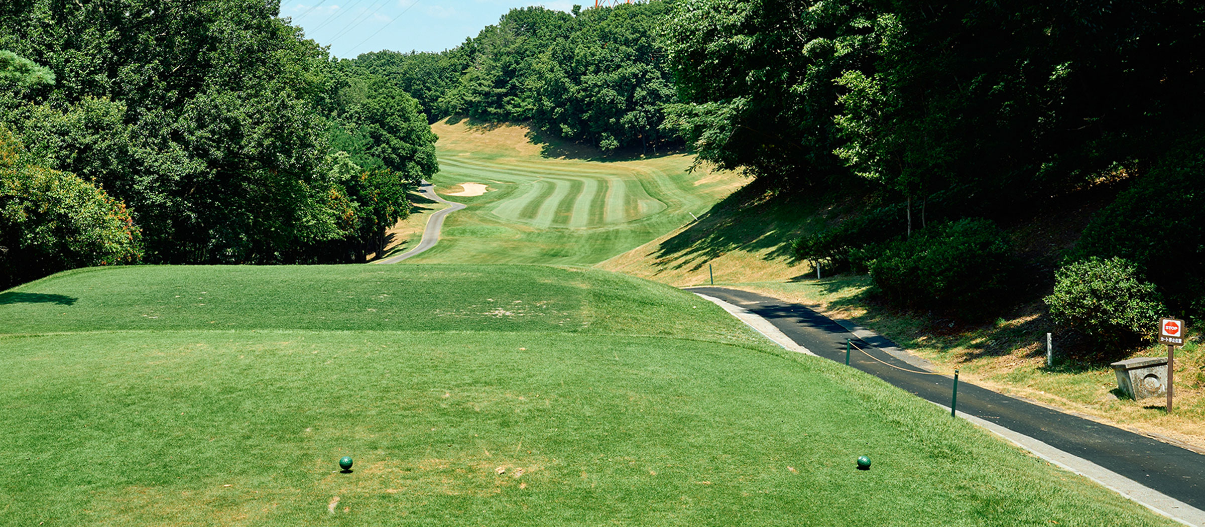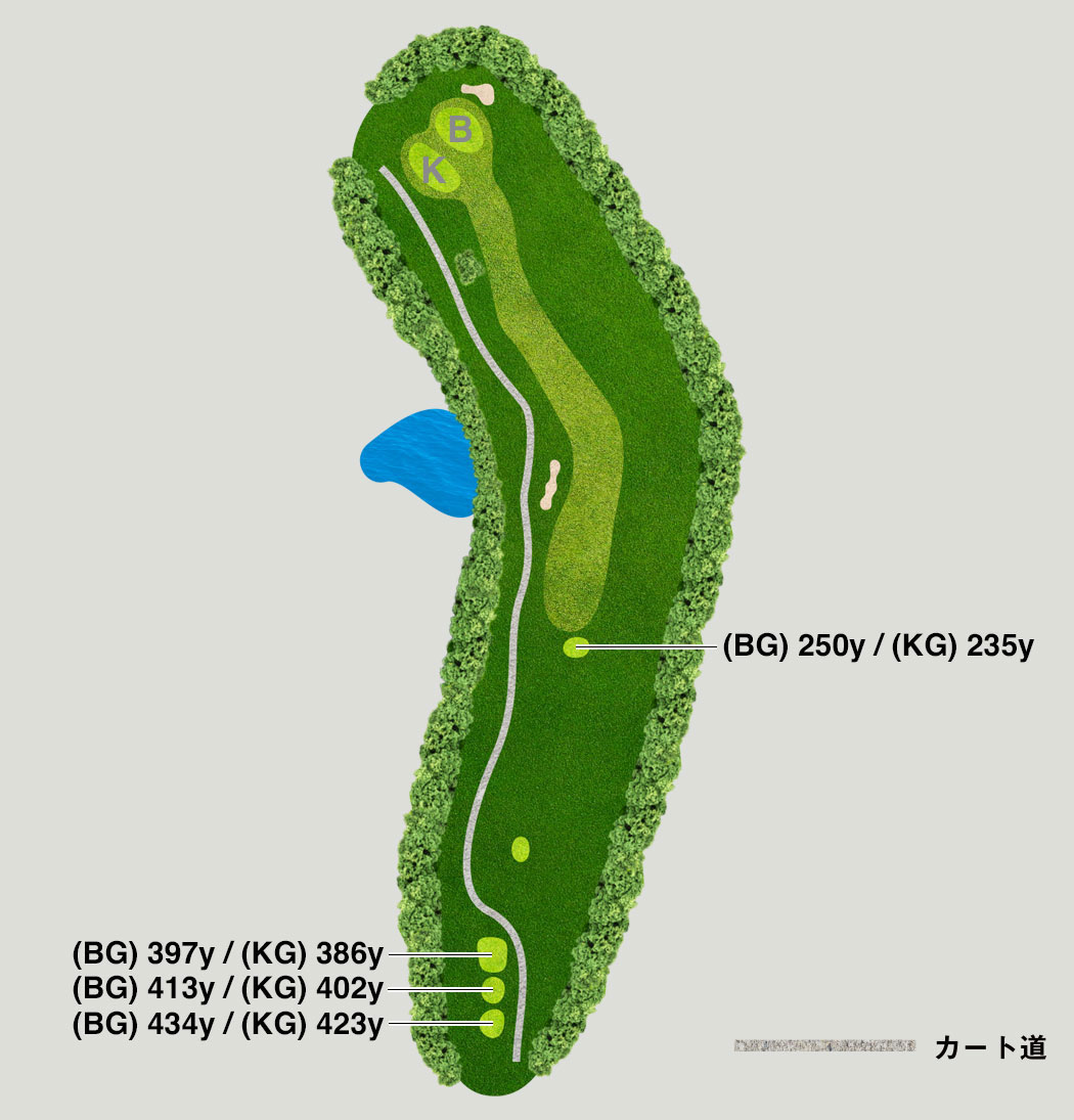 左ドッグレッグのミドルホール。左OBとグリーン奥の浅いOBに注意して攻めましょう。