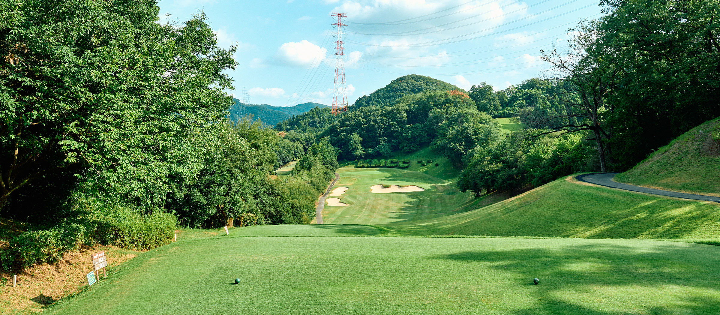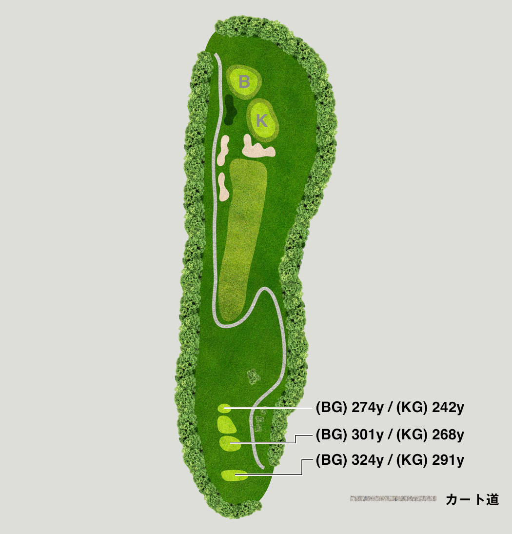 正面に広がるKMCCの美しい植え込みが印象的な打ち下ろし。グリーン左奥の浅いOBに注意し、方向性を重視。