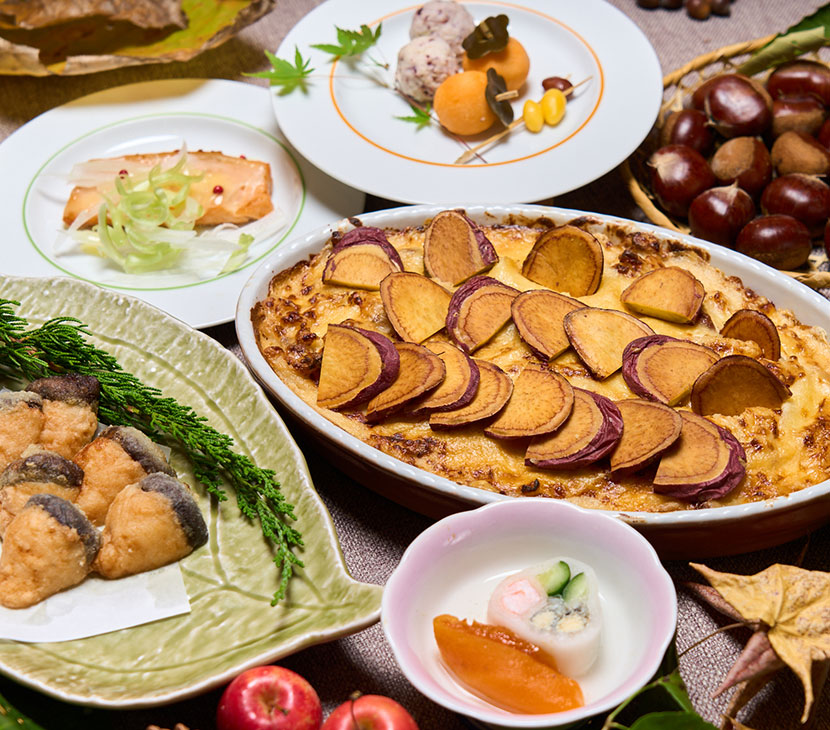 見た目にも美しい約30種類の料理が並び、季節ごとに食材の表情も移ろいます。