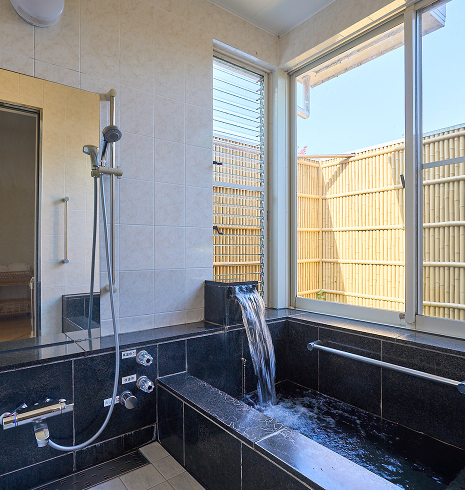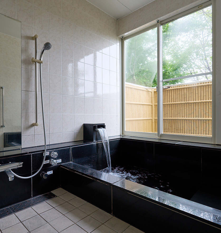 約83㎡のゆとりある室内に、吹き抜け天井で開放的なリビングやプライベート天然温泉、ゲストルームなどを配置。