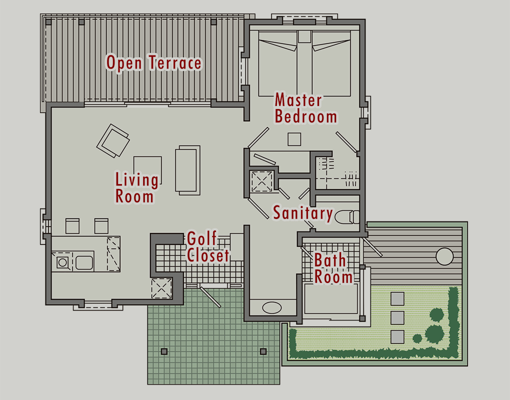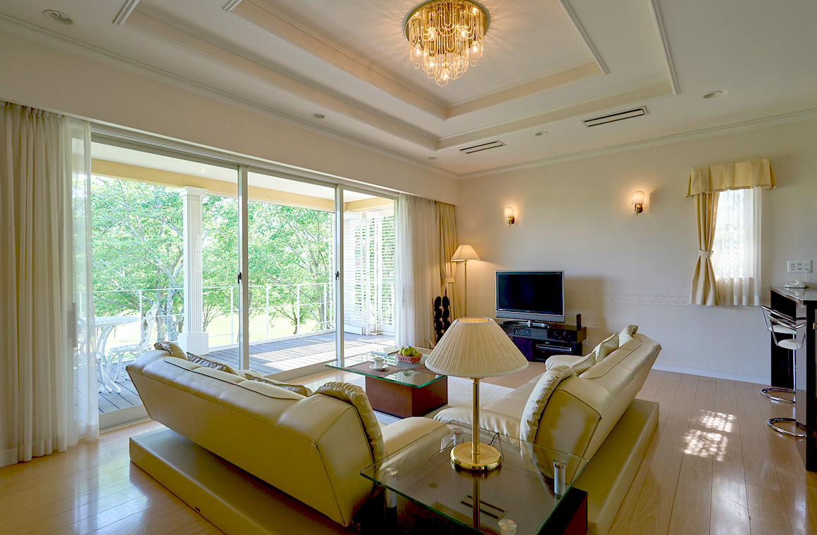 ワイドテラスヴィラより一回り大きく、開放感のある吹き抜けが特徴的な客室。テラスの眼前には17番ホールのグリーンが広がり、唯一無二の景観を形づくります。木質の温かみが感じられるリビングで、まるで欧米ツアーのワンシーンを見ているかのような情景が、極上のリラックスタイムを演出します。