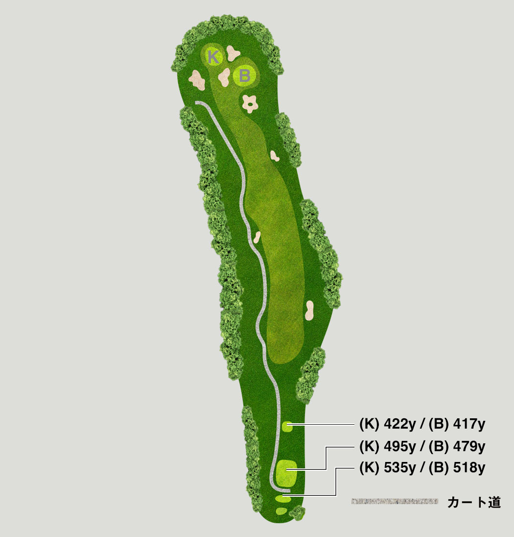 ティーショットは右のOBゾーンに注意し、左の山裾へ確実に打つのが安全なルートです。