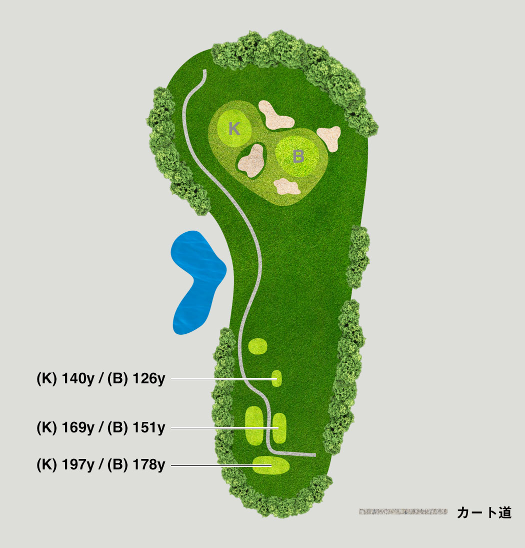 グリーン手前のバンカーは避けて、グリーンのアンジュレーションに要注意です。