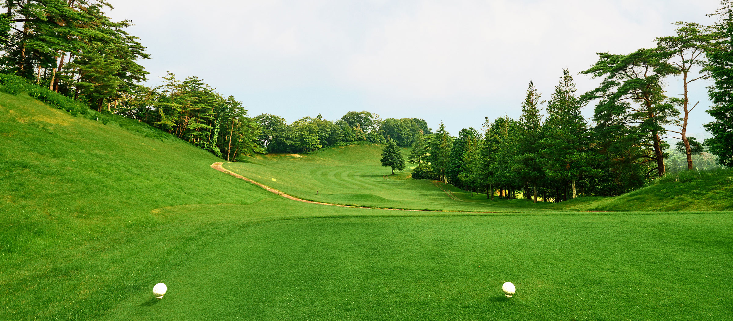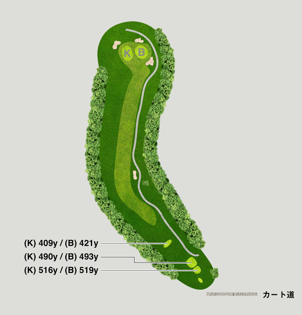 ロングヒッターは右の松の木の上を抜いて、フェアウェイ左が安全策です。