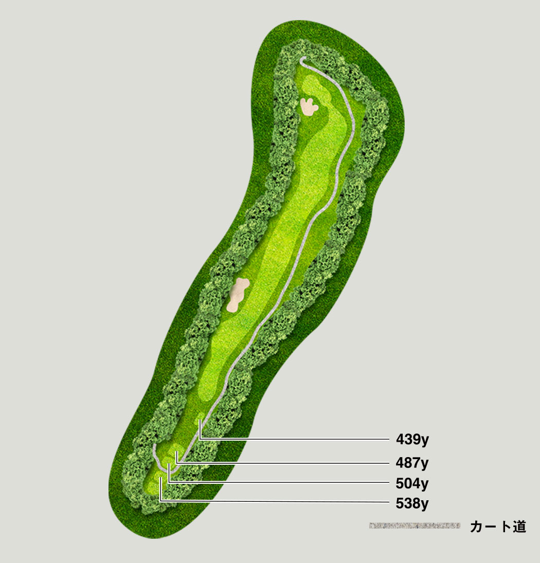 途中からゆるやかな左ドッグレッグになっているロングホール。ティーショットは確実にフェアウェイセンターに置いていきたい。グリーンは横長で正面からは奥行きがないため、フェアウェイ右サイドから攻めていきたい。