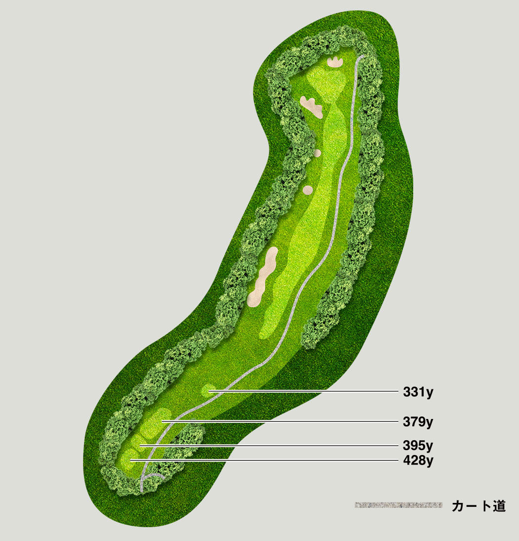 左ドッグレッグで距離のあるミドルホール。フェアウェイが二段になっているため、ティーショットは吹き流し右側カート道路方向が狙い目。全体的に左に傾斜しているところも多く、左はOBも近く狭いため、セカンドショット以降も右方向から攻めていきたい。