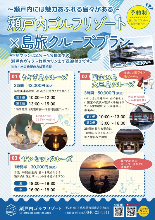 瀬戸内の穏やかな海と、魅力あふれる島々をめぐる特別なクルーズ体験をご用意しました。ゴルフの後は、非日常のひとときを楽しみませんか?