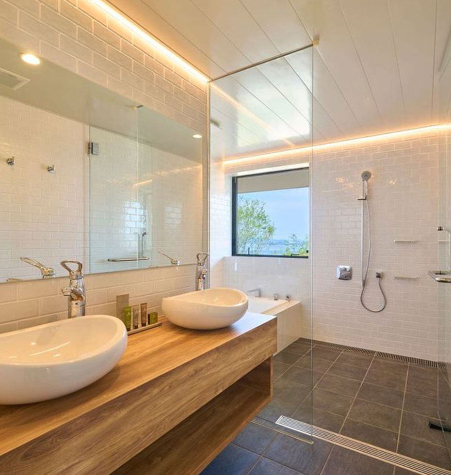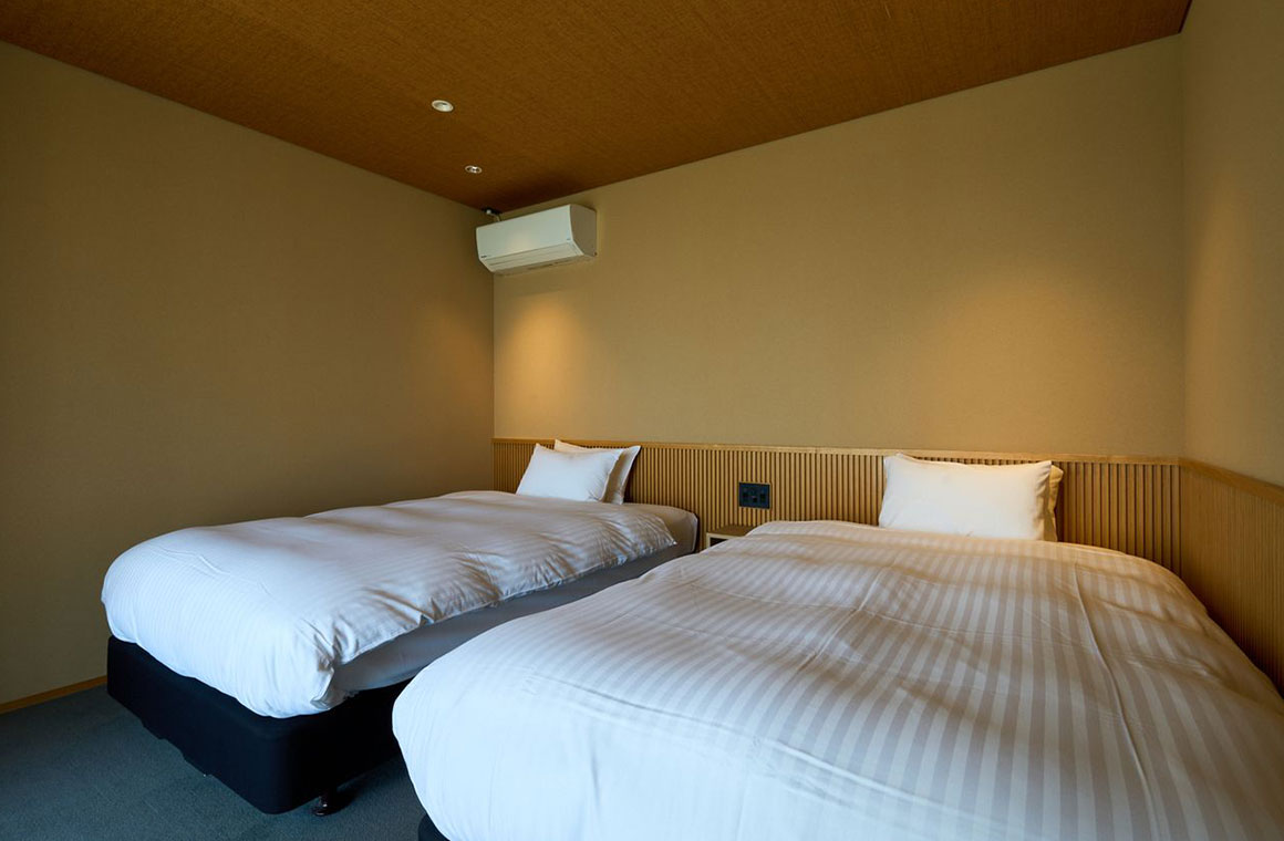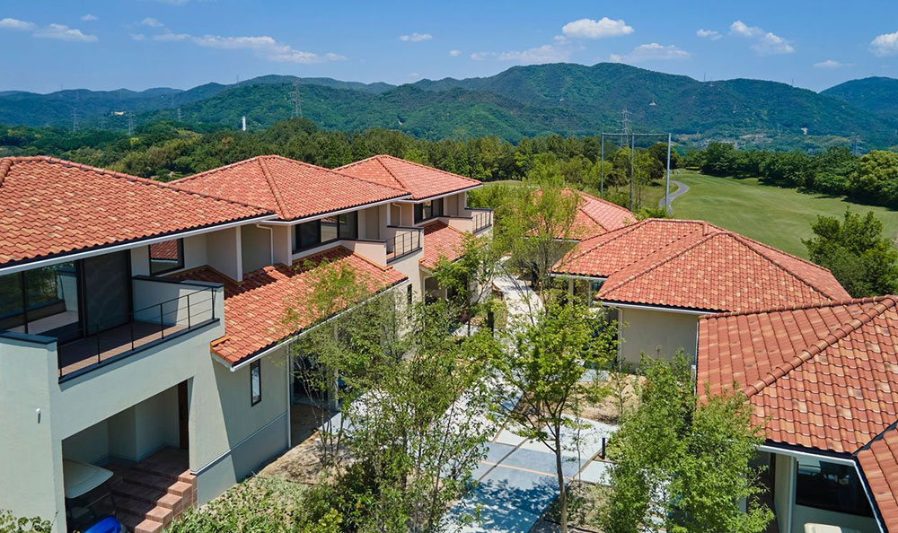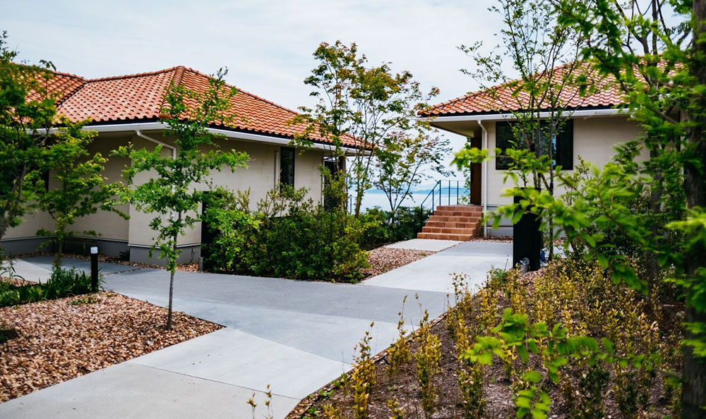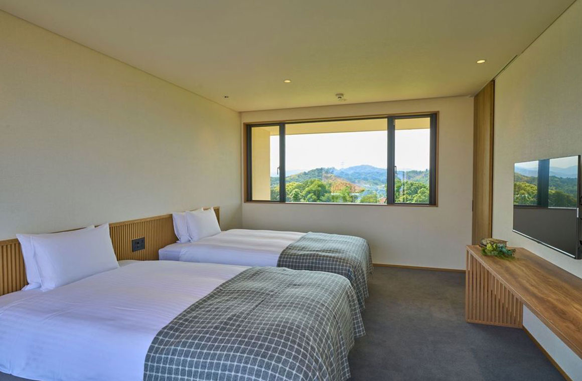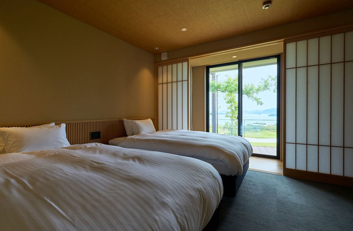 1階にリビング、2階に寝室と浴室を配置した連棟型ヴィラ。その特徴的な間取りは、ゴルファーたちの好奇心をくすぐり、滞在時間をより特別なものへと変えてくれるでしょう。また約74㎡の広さがあり、プライバシーを確保しながら、瀬戸内の海と山を一望できる眺望をお楽しみいただけます。落ち着いた滞在をご希望の方に最適です。